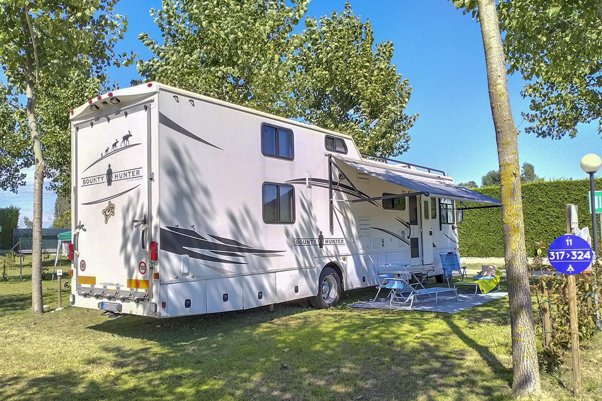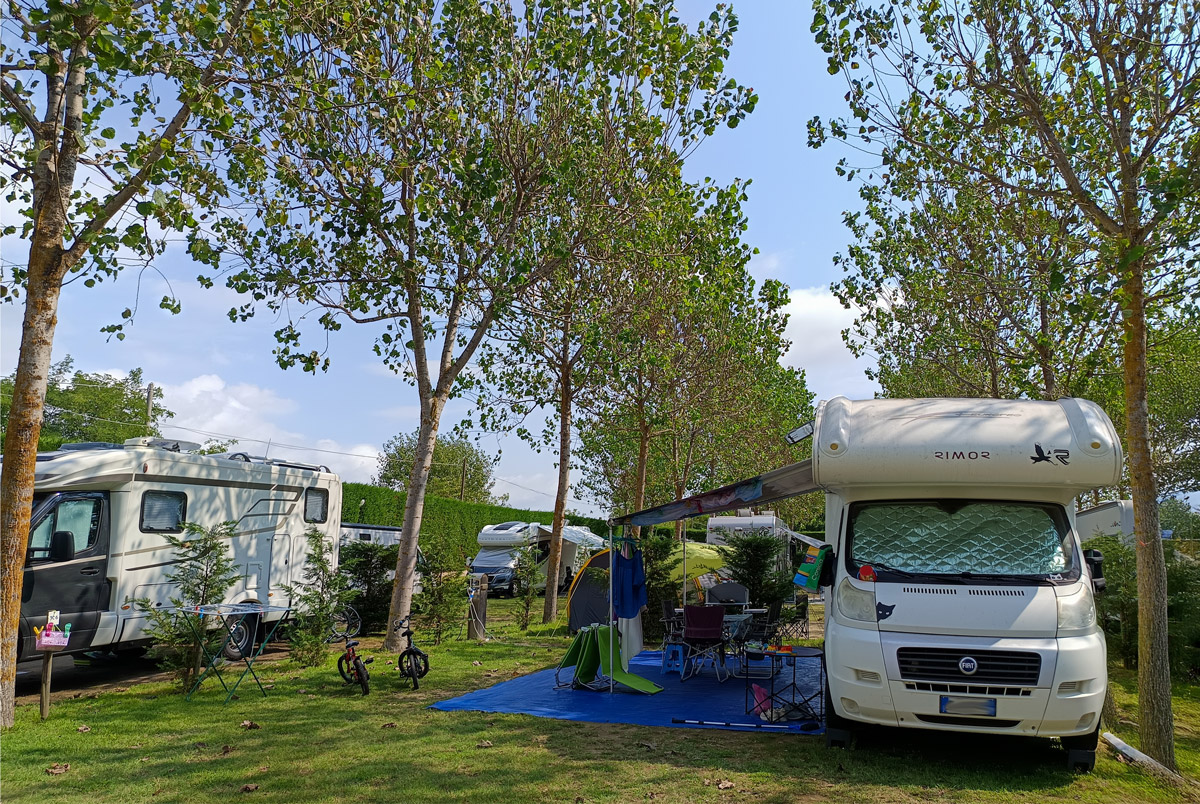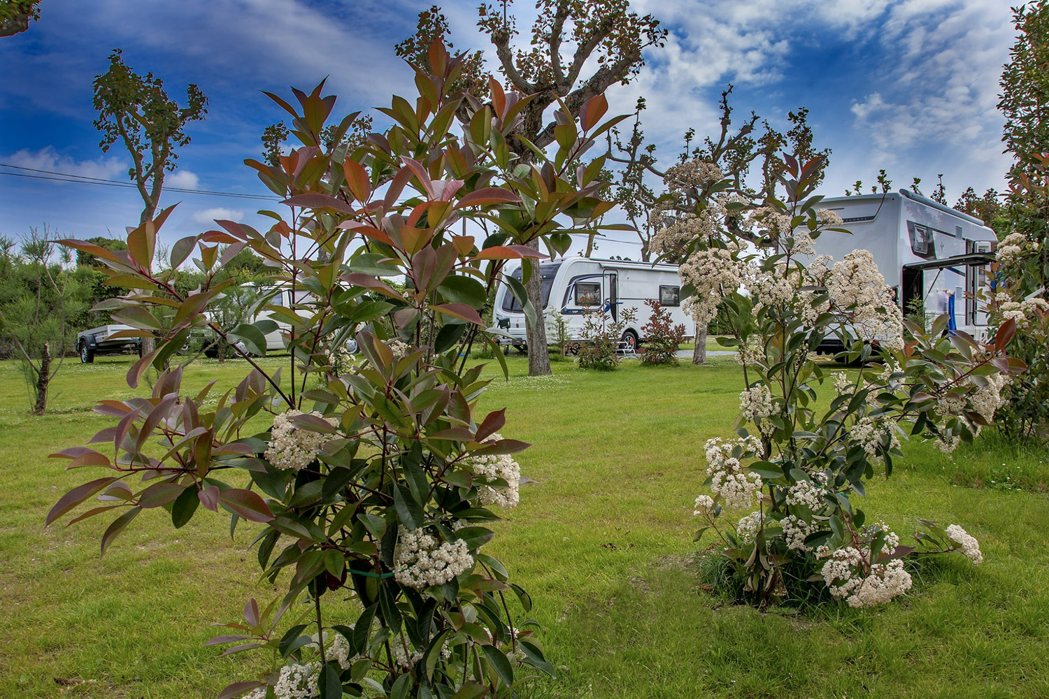 Großzügige, ausgestattete Stellplätze, geeignet für Wohnmobile, Wohnwagen oder große Zelte.