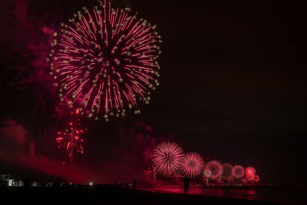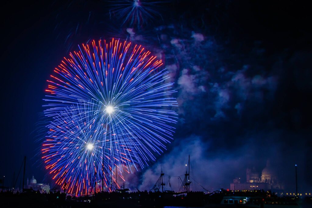 Mit dem Schlag der Stunde erleuchten die Feuerwerke den Himmel mit Lichtspielen und Reflexionen auf dem Wasser und zeichnen ein Kaleidoskop von Farben hinter Türmen, Kuppeln und Glockentürmen.