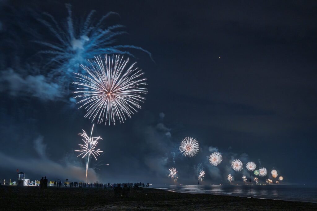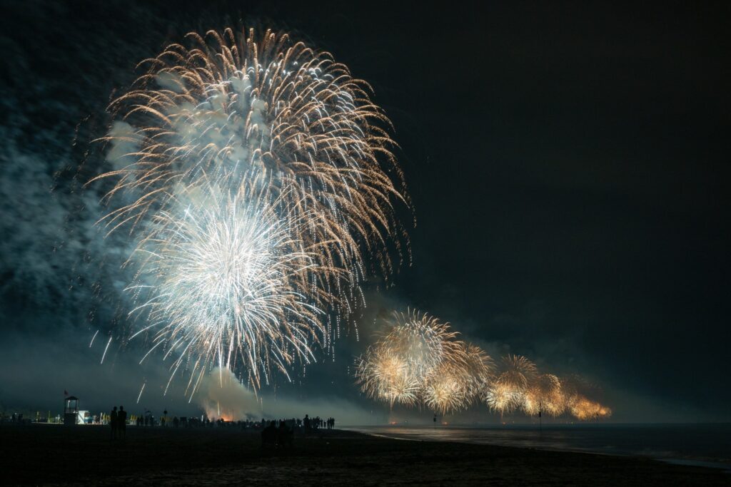 Der Beach on Fire erstreckt sich über 13 Kilometer Strand, mit einer Abfolge von synchronisierten Feuerwerken, die von der gesamten Küste aus sichtbar sind. Die Startstellen, die entlang der gesamten Küste verteilt sind, erzeugen einen durchgehenden und mitreißenden visuelleffekt.